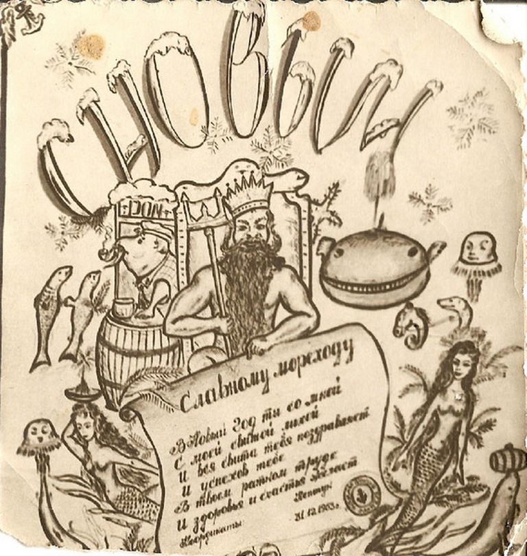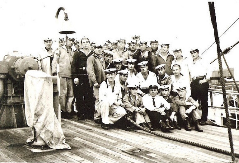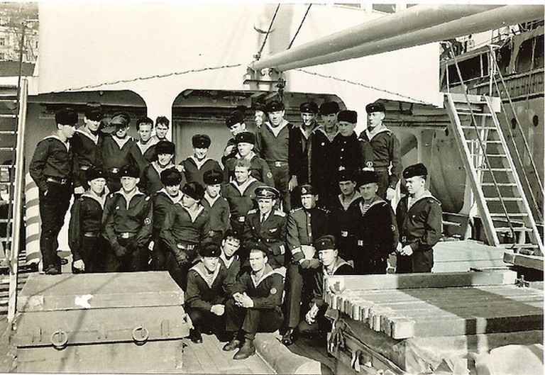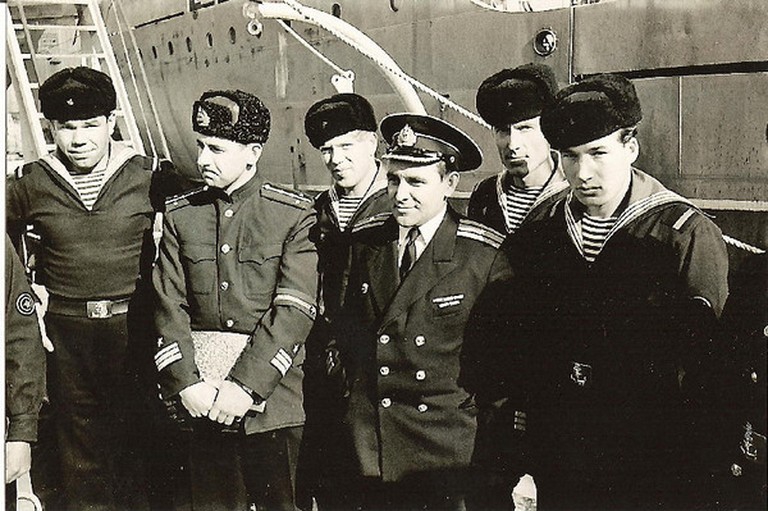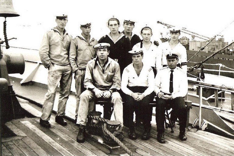 "Дембель 1965 года. Сидят:Тихонов Н. ; Канин И.В. из Якутии ; ком. корабля Никифоров ;