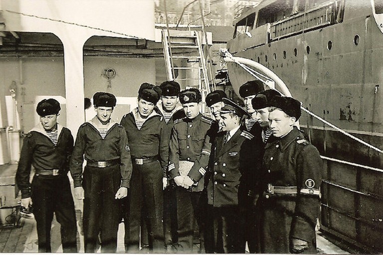 Справа налево: акустик Еренков С., рулевой-сигнальщик Столяров Г.И., моторист Клименков М., командир корабля капитан 3 ранга Фадеев Н.П., радист Касаткин С., помошник командира капитан-лейтенант Максименко Ю.С. (будущий начальник разведки ТОФ),Тихонов Н., Масягутов Э.Г., оператор РЛС "Нептун"Архипов, Поликарпов А. |