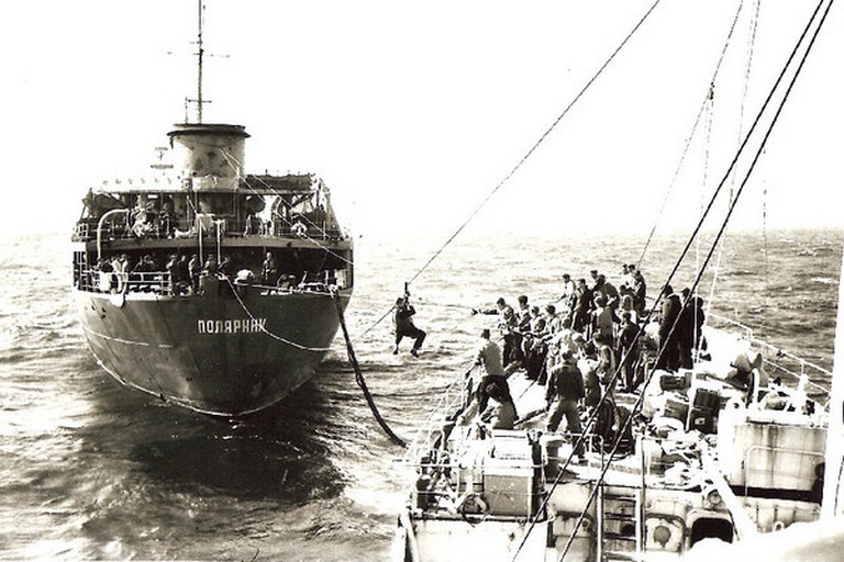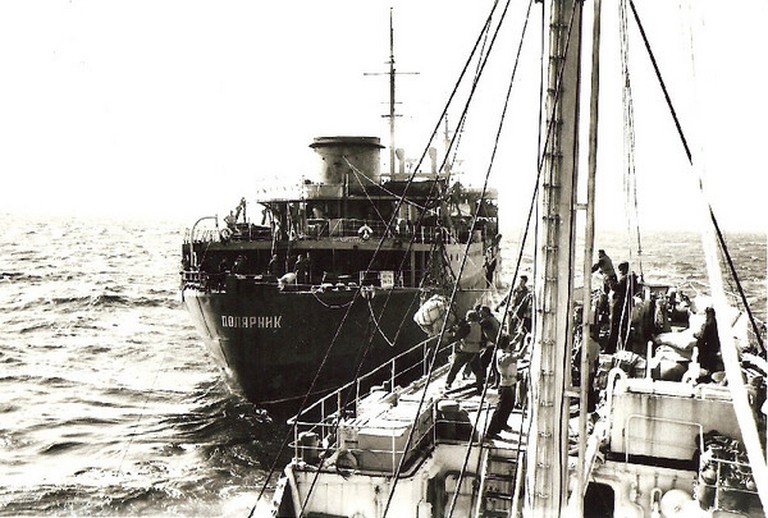 Передача танкером "ПОЛЯРНИК" топлива, припасов и члена команды корабля (он находился