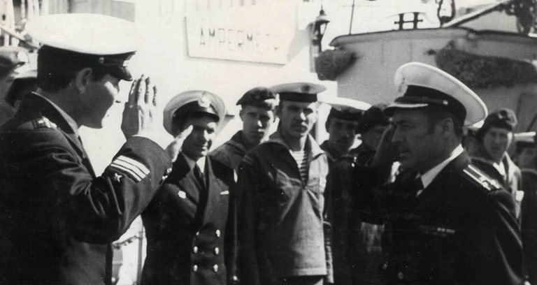 Доклад командира мрзк "Вега" Майтакова Г.Г. начальнику разведки ТОФ капитану 1 ранга Леонову В.Ф. о готовности корабля к выходу в море, на заднем плане мичман Яворчук П.; |