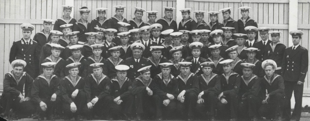 Слева направо ст.мичман Данов, ст. лейтенант Браславец С. - корабельный врач, капитан-лейтенант Майтаков Г.Г.-командир; капитан-лейтенант Козловский В.В.-ЗКР; ст.лейтенант Волков С.-инженер РТС, присел ст.мичман Закалюкин Г.Е.-старшина команды электриков.