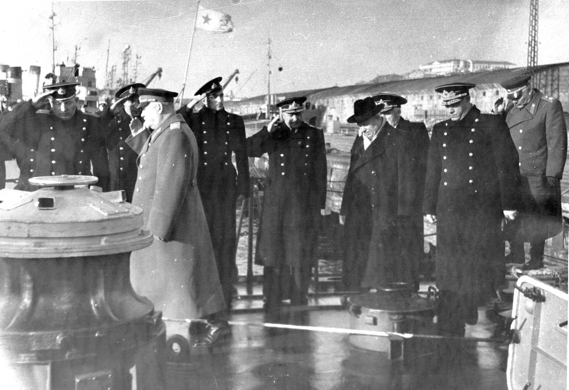 Однажды, в 1950 году, когда я оставался старшим на корабле, на завод прибыл Командующий 5-ым Военно-морским флотом («Южным ТОФ») контр-адмирал Н.Г. Кузнецов, бывший опальный Нарком ВМС.