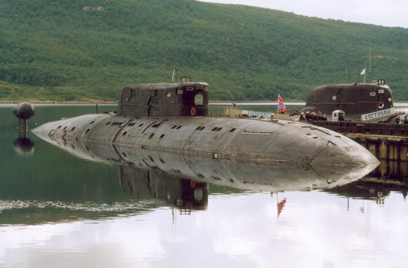 Слева большая АПЛ "Псков" проекта 945А "Кондор", справа АПЛ "Кострома" проекта 945 "Барракуда". Главное визуальное отличие - форма носовой части ограждения выдвижных устройств и боевой рубки.
