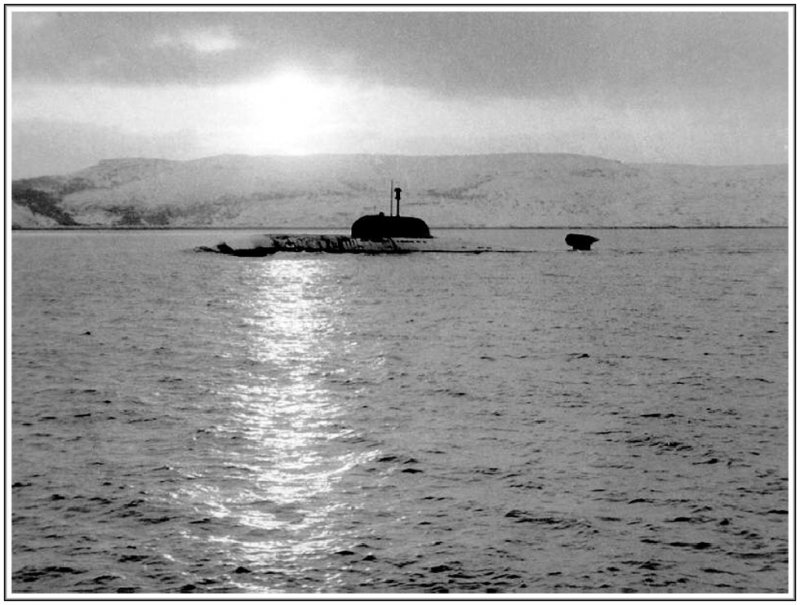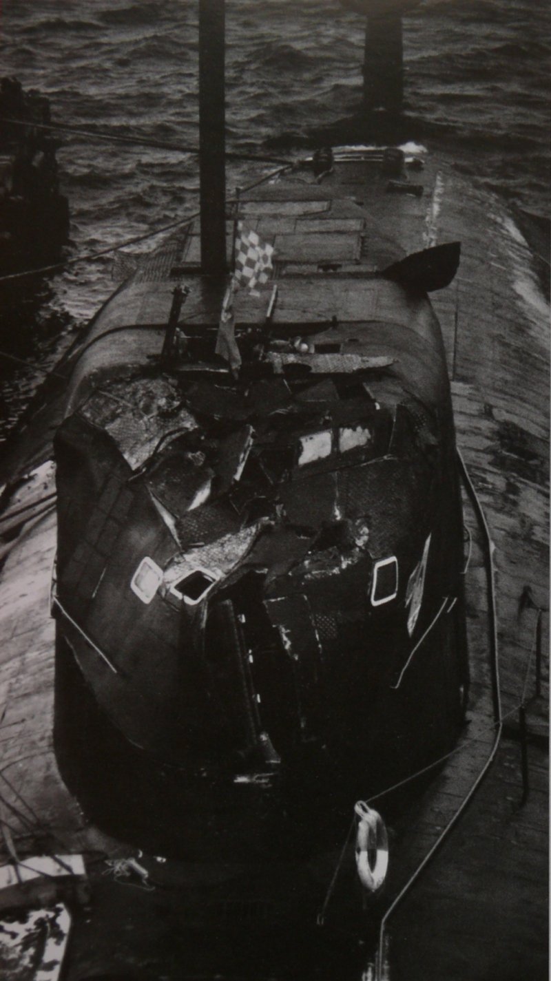 АПЛ К-276 (зав. № 302, с 03.06.1992. - Б-276, с 06.04.1993. - "Краб", с 15.11.1996. - "Кострома"), после столкновения 11 февраля 1992 года с АПЛ «Батон-Руж» класса «Лос- Анджелес». Снимок сделал во время сопровождения лодки в базу с борта спасательного буксира СБ-523 дежуривший на нём в числе спасательного отряда Северного флота.